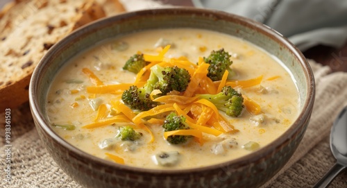 Creamy cheddar cheese and broccoli soup served in bowl
