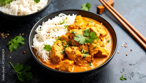 curry, chicken, rice, noodle, bowl, food, dish, meal, spicey, flavorful, protein, healthy, delicious, indian, asian, cookery, dinner, lunch, eatery, appetising, tasty, aromatic, savoury, creamy, gold, pale, dark, dark brown, fresh, vegetable, spice, ingredient, serving, portion, plate, asian cuisine, colourful