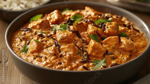 Creamy Chicken Tikka Masala Garnished with Fresh Herbs and Served with Nutty Wild Rice in a Rustic Bowl