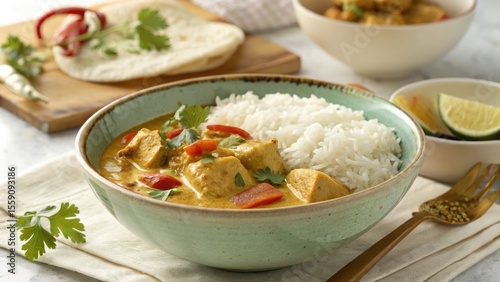 curry, coconut, creamy, rice, cilantro, chili, lime, food, dish, bowl, cookery, asian, indian, thai, spicey, savoury, delicious, healthy, meal, dinner, lunch, garnish, fresh, cooked