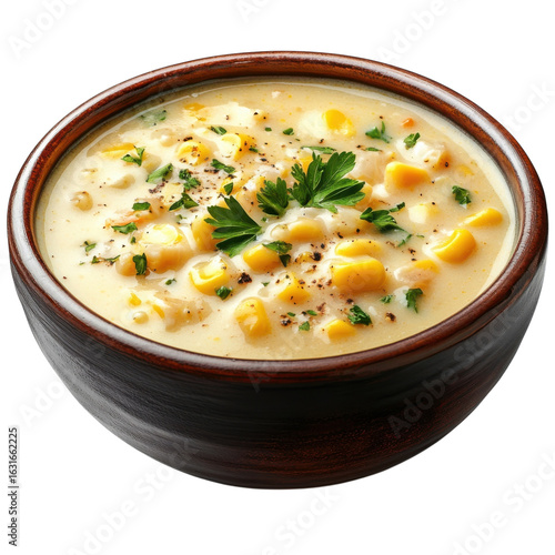 Creamy corn chowder in a wooden bowl, garnished with fresh parsley and pepper, a comforting and delicious soup perfect for autumn and winter meals on transparent background