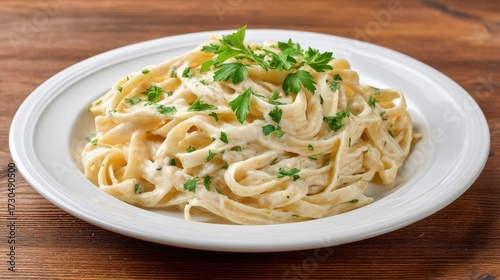 Creamy Fettuccine Pasta Dish with Fresh Parsley Garnish on Wooden Table Surface for Delicious Italian Cuisine Presentation