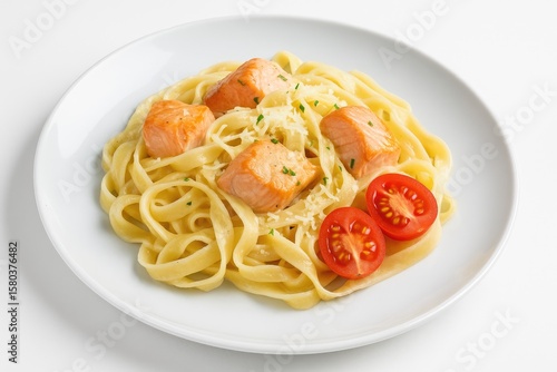 Creamy fettuccine pasta topped with salmon slices on a plain white backdrop