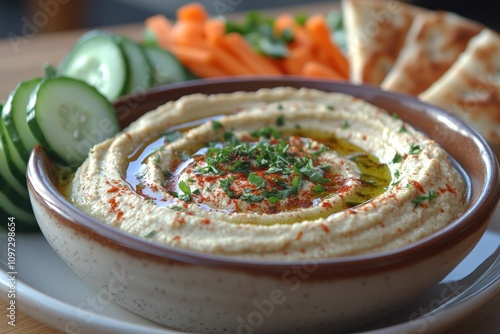 hummus, dip, chickpea, delicious, food, cookery, meal, dish, vegan, vegetarian, healthy, snack, receipe, cooking, eat, tasty, flavorful, alimentary, mediterranean, middle, eastern, culinary, parsley, paprika, olive, oil, pita, bread, cucumber, carrot, vegetable, bowl, brown, plate, closeup, photo, gastronomy, epicure, dining