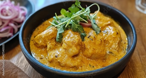 Creamy Indian Chicken Curry in Bowl on Wooden Table with Side Dish