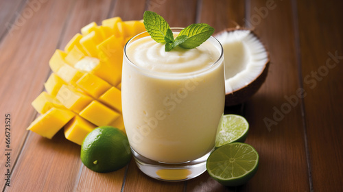 creamy mango coconut smoothie with lime accent on wooden surface