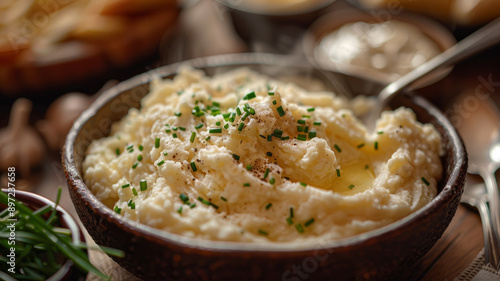 Creamy mashed potatoes garnished with chives in a rustic bowl.