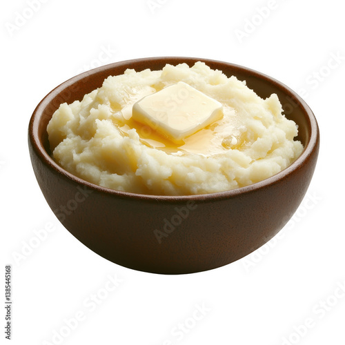 Creamy mashed potatoes topped with a rich pat of butter, served in a rustic brown bowl, perfect for comfort food lovers and culinary presentations.