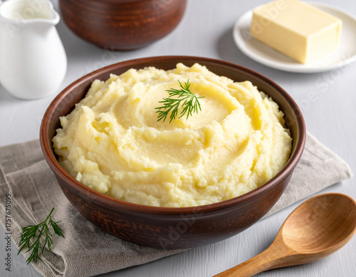 Creamy Mashed Potatoes with Dill Garnish, Butter, and Milk on Rustic Table.