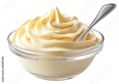 Creamy mayonnaise in a glass bowl, a silver spoon touches the top