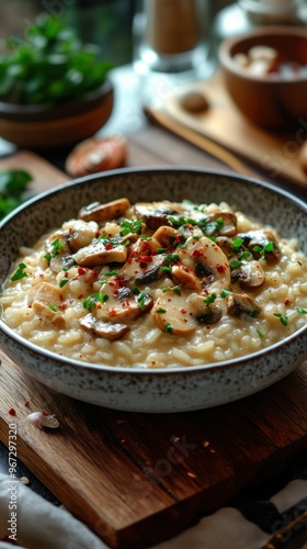 risotto, mushroom, creamy, rustic, wooden, table, food, culinary, art, comfort, dining, italian, cookery, herb, parsley, mushroom, home, cooking, epicure, warm, lighting, side, dish, main, course, receipe, favor, plate, bowl, delicious, fresh, ingredient, decor, setting, styling, inviting, seasonal, homemade, vegetarian