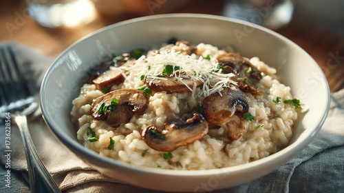 Creamy mushroom risotto served in a white bowl, garnished with fresh parsley and grated parmesan cheese, a comforting and elegant italian dish