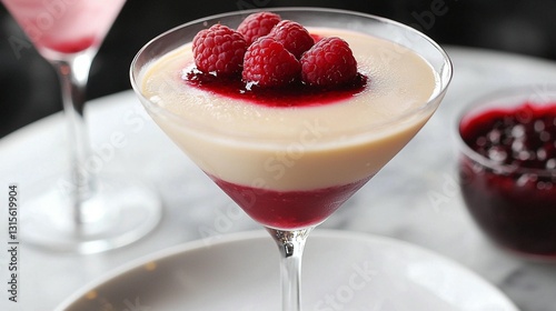 Creamy panna cotta dessert with raspberry coulis and fresh raspberries in a martini glass.