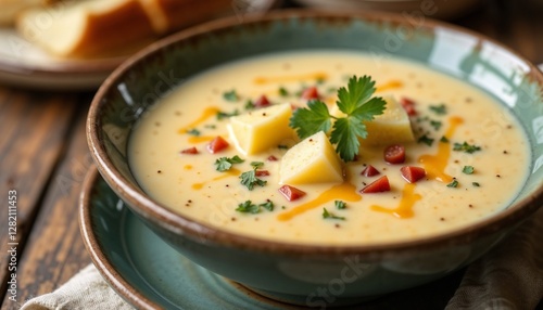 Creamy potato soup with herbs and spices in a rustic bowl on a wooden table