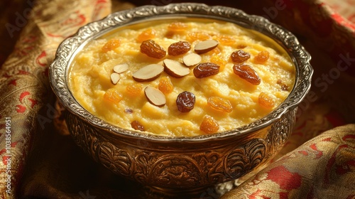 dessert, rice, pudding, cream, sweetness, almond, grape, bowl, traditional, festive, garnish, yellow, rich, favor, homemade, treat, cookery, ingredient, food, celebration, culture, delicious, spoon, dish, aromatic, texture, creamy, indulgent, harvest, snack, warm, colourful, luxury, serving, banquet, plate, meal, nature, organic, indulgence, kitchen, ingredient, delicacy, ethnic, presentation, romance, unique