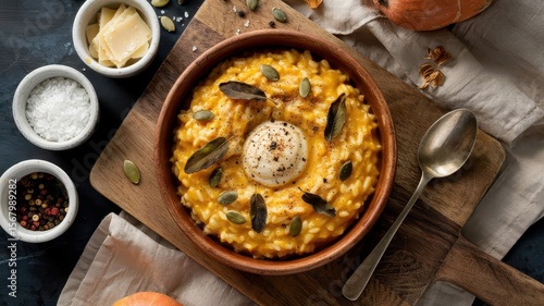 creamy, risotto, butternut, squash, rice, italian, cookery, epicure, bowl, terracotta, rustic, wooden, board, orange, pumpkin, seed, sage, leaf, cheese, pepper, salt, spoon, food, cooking, dinner, lunch, meal, dish, delicious, appetising, homemade, eatery, culinary, shadow, lighting, consistency, luxurious, overhead, parmesan, herb, autumn, seasonal, comfort, warm