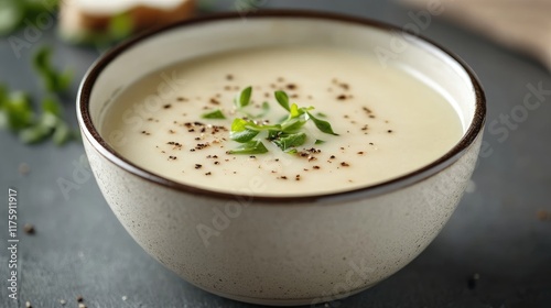 Creamy Soup in Ceramic Bowl with Fresh Garnish and Pepper. A close-up of a creamy soup, garnished with fresh herbs and sprinkled with ground pepper, served in a ceramic bowl placed on a dark backdrop.