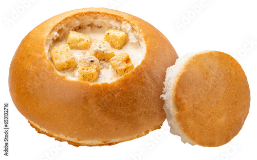 Creamy soups to serve in a bread bowl isolated on white background, Cheesy Soup in a Bread Bowl on white PNG File.