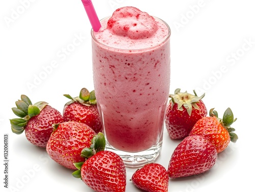 Creamy strawberry milkshake loaded with fresh strawberries blended smoothly and presented on a clean white background
