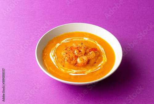 Creamy sweet potato soup with shrimp. Healthy eating. Diet.