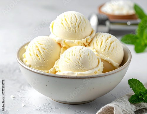 vanilla, ice cream, cream, dessert, scoop, bowl, white, texture, food, sweet, refreshing, closeup, cold, fresh, creamy, delicious, mint, garnish, summer, treat