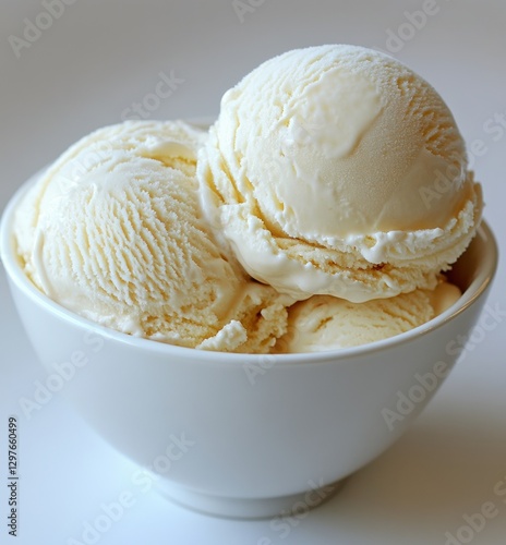 Creamy vanilla ice cream scoops in a white bowl on a light background, perfect for summer desserts and sweet treats for all occasions
