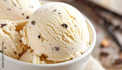 Creamy vanilla ice cream scoops with chocolate flakes in a bowl, perfect for dessert lovers and summer indulgence