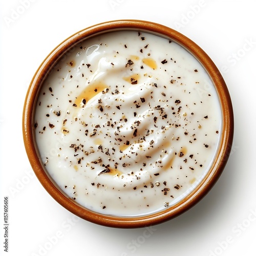 Creamy white sauce in a rustic ceramic bowl on a plain white background