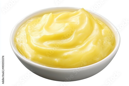 Creamy yellow custard dessert in a white bowl, perfect for culinary presentations