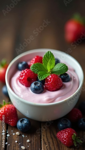 Creamy yogurt with berries & mint, rustic wood background, rustic, delicious