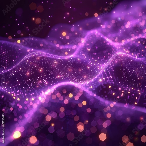 Create a seamless looping animation of a glowing purple particle field with subtle hexagonal shapes drifting in the background.