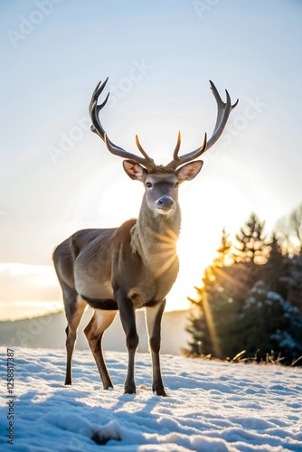 Create a serene and picturesque image of a deer standing in a snowy landscape.