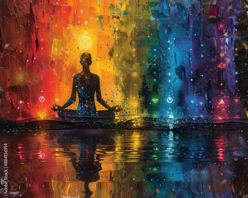 Create a surrealistic painting of a person meditating in a lotus position, with a glowing aura and chakras aligning in the background.