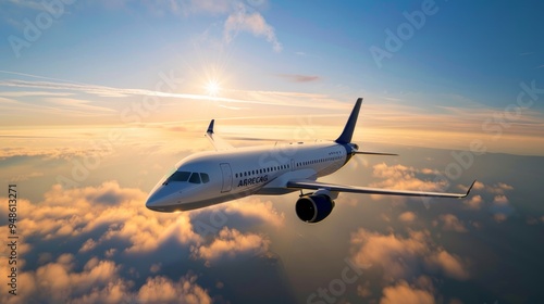 Create an image of a sleek, modern commercial airplane soaring through a clear blue sky, with fluffy white clouds and a golden sunset in the background.
