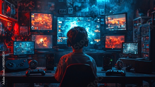 create, image, asian, boy, playing, virtual, hockey, game, his, living, room, filled, gaming, equipment, tech