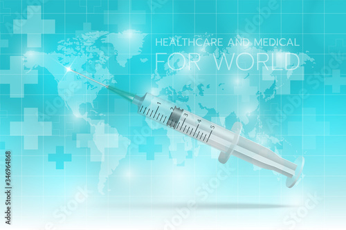 Create image a syringe on the world map and abstract geometric medical cross shape medicine and science concept cyan background, Healthcare and Medical for the world, The World health day.
