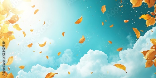 Creative Abstract Autumn Blue Background Featuring Dreamy Sky with Yellow Leaves and Plant Elements, Representing the Essence of Fall, Light, and Nature for Advertising and Marketing Purposes