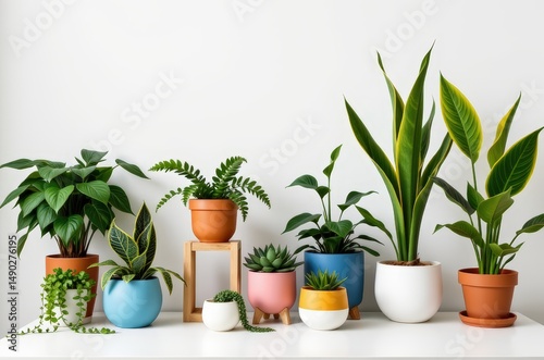creative arrangement of indoor plants, ferns, and succulents in colorful pots, modern apartment