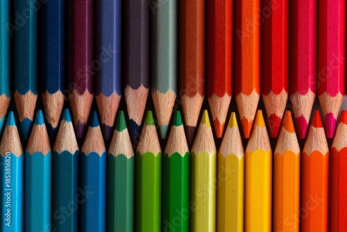 Creative background of colored pencils arranged tips to tips, symmetry of artistic drawing tools, multicolored stationery for school and office, top view of wooden pencils collection
