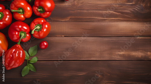 Creative composition of red tomatoes and pepper around a wooden box on a wooden brown table, top view, flat lay in vintage colors style, copy space