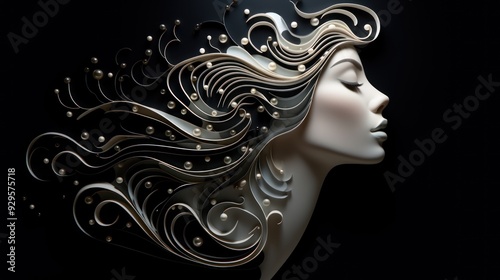 Creative design with white pearls creating the silhouette of a woman's face and flowing hair, set against a background