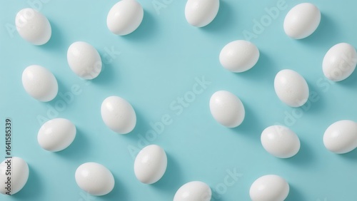 Creative Easter holiday backdrop featuring white eggs and space for text on a blue surface.