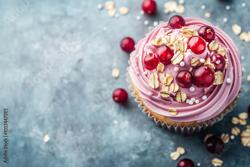 Creative food concept. Cranberry Cupcake muffin cake with topping of berry berries and oatmeal oats icing frosting sprinkles . copy text space