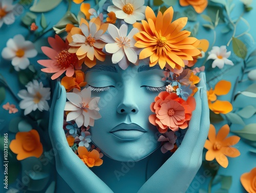 creative hands cradling a paper head symbolizing the human brain adorned with blooming flowers, representing self-care and mental health positivity in a vibrant concept
