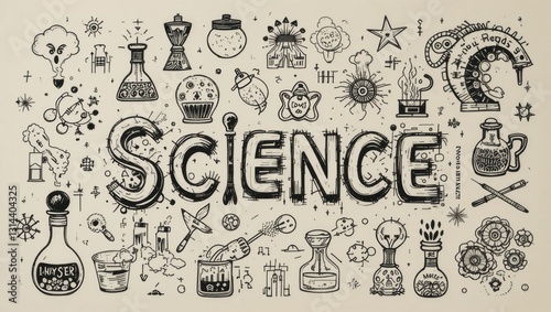 Creative Illustration Depicting Various Science Elements and Concepts with a Central Focus on Science
