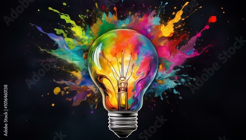 Creative light bulb explodes with colorful paint and splashes on a black background. Think differently creative idea concept