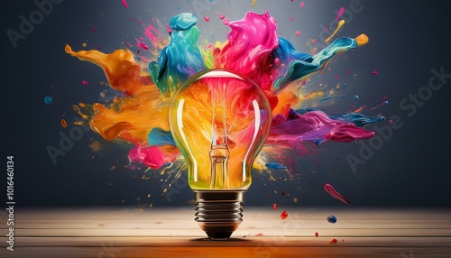 Creative light bulb explodes with colorful paint splashes. Brainstorming concept. Banner