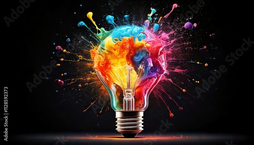Creative Light Bulb Explosion with Colorful Paint and Splashes on Black Background