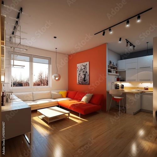 Creative living room interior design. Beautiful apartment flat design. Modern interior style. Studio interior