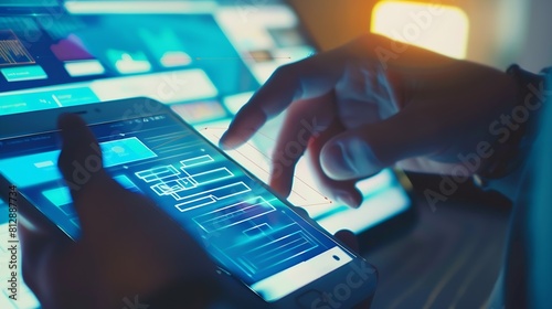 Creative ux designer designing screens for mobile responsive application development with UI UX Developing wireframe sketch layout design mockup on smartphone screen : Generative AI